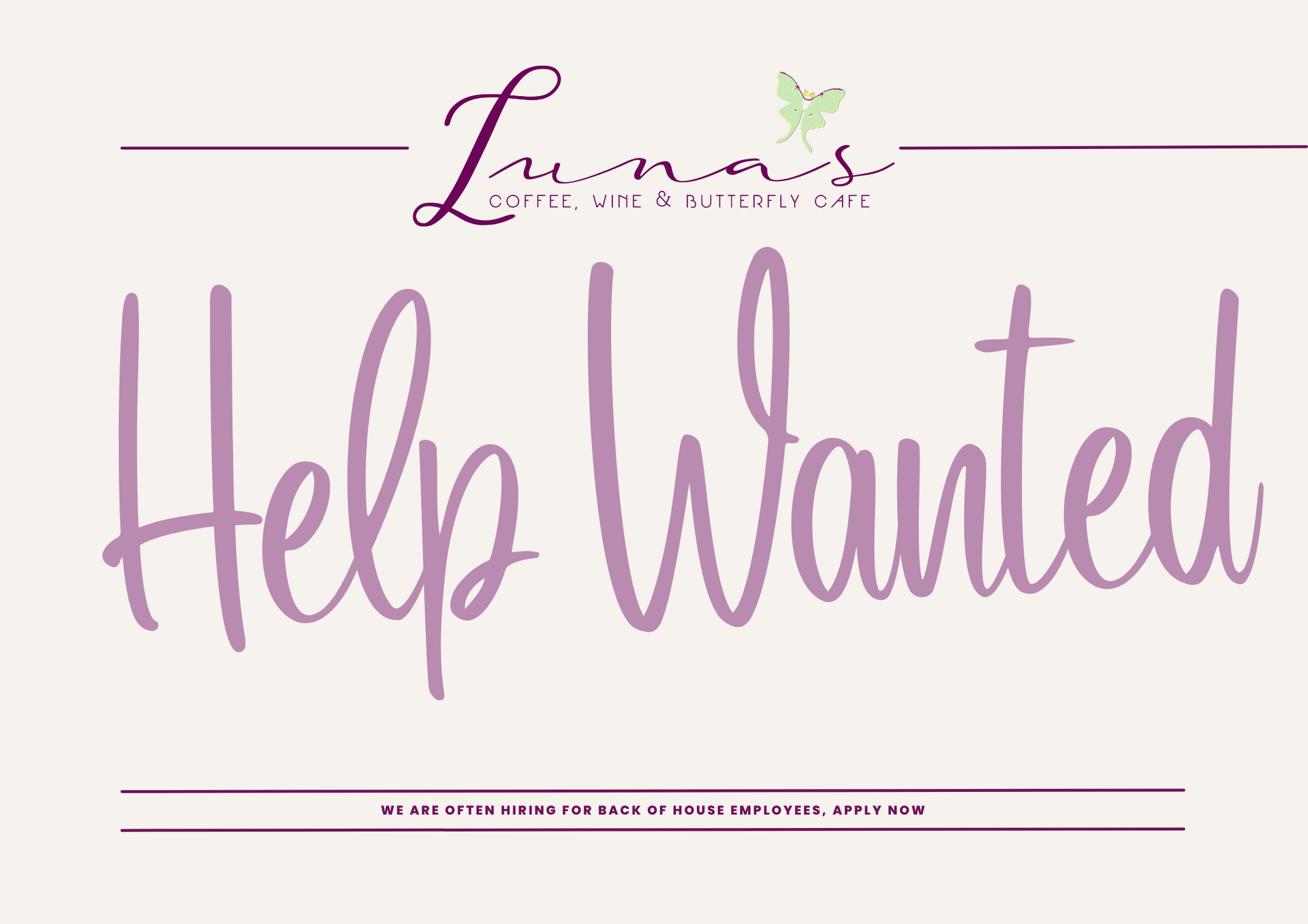 Looking for employment opportunities with Luna's? Send your application to lunasbutterflycafe@gmail.com