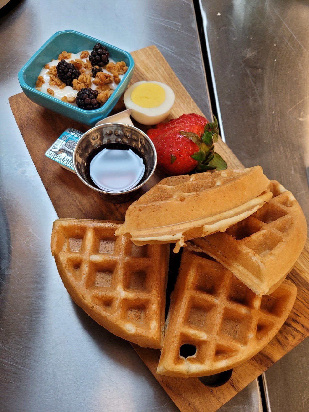 Belgian waffle, yogurt and fresh fruit, sliced hard boiled egg, and delicious spreads and dips.
